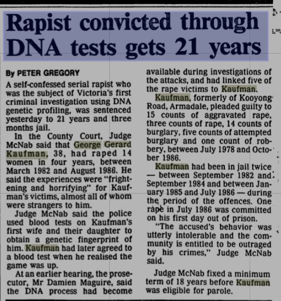 (Kaufman Case 1989): Publicized as a landmark in forensic DNA profiling in Australia, changing how sexual assault evidence was interpreted.