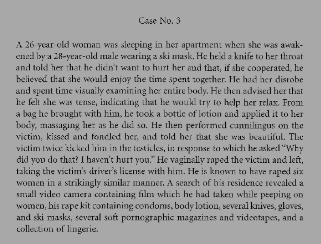 This mirrors the pseudo-relationship, flattery, and control seen with Nicola: the offender frames the encounter as a shared, almost romantic experience, using psychological manipulation and ritualized behavior to enforce his fantasy.
